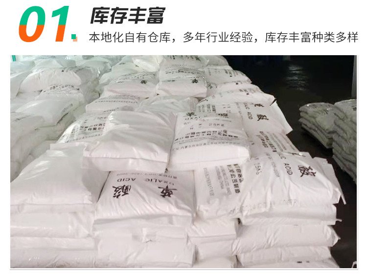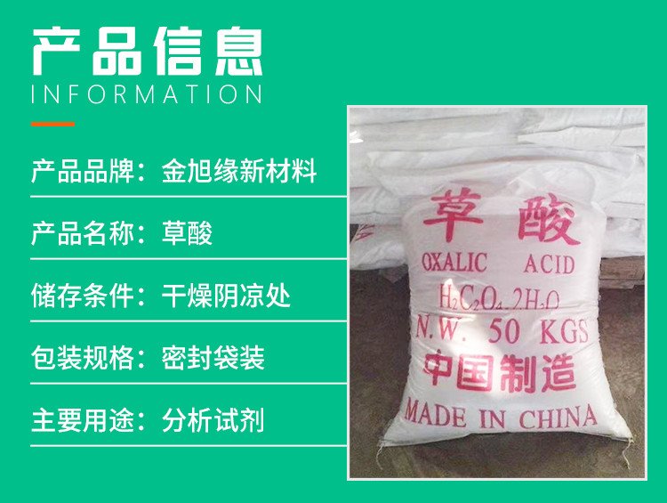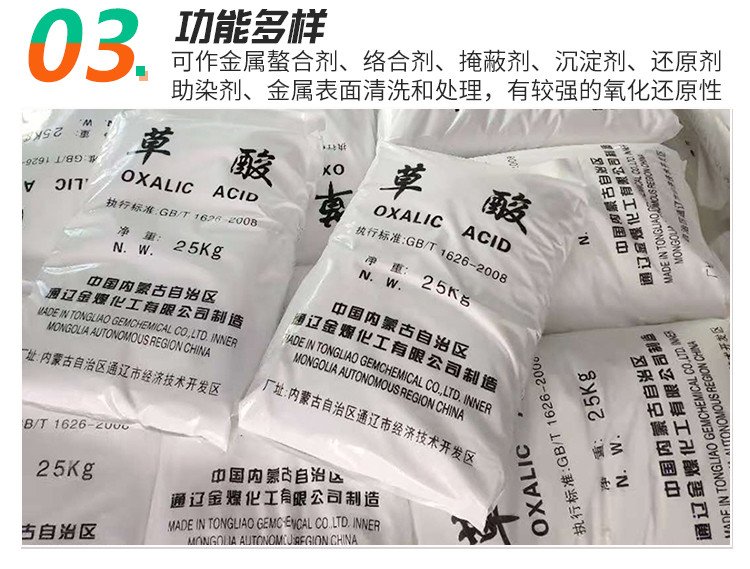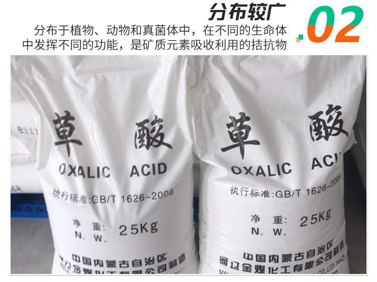 草酸,即乙二酸,最簡單的有機(jī)二元酸之一。結(jié)構(gòu)簡式HOOCCOOH。它一般是無色透明結(jié)晶,對人體有害,會使人體內(nèi)的酸堿度失去平衡,影響兒童的發(fā)育,草酸在工業(yè)中有重要作用,草酸可以除銹。草酸遍布于自然界,常以草酸鹽形式存在于植物如伏牛花、羊蹄草、酢漿草和酸模草的細(xì)胞膜,幾乎所有的植物都含有草酸鹽。 產(chǎn)品用途: 絡(luò)合劑、掩蔽劑、沉淀劑、還原劑。分析中用以檢定和測定鈹、鈣、鉻、金、錳、鍶、釷等金屬離子。顯微微晶分析檢驗(yàn)鈉和其他元素。沉淀鈣、鎂、釷和稀土元素。校準(zhǔn)高錳酸鉀和硫酸鈰溶液的標(biāo)準(zhǔn)溶液。漂白劑。助染劑。也可用來除去衣服上的鐵銹建筑行業(yè)在涂刷外墻涂料前、由于墻面堿性較強(qiáng)應(yīng)先涂刷草酸除堿。 醫(yī)藥工業(yè)用于制造金霉素、土霉素、四環(huán)素、鏈霉素、冰片、維生素B12、苯巴比妥等藥物。印染工業(yè)用作顯色助染劑、漂白劑、醫(yī)藥中間體。塑料工業(yè)用于生產(chǎn)聚氯乙烯、氨基塑料、脲醛塑料。 用作酚醛樹脂合成的催化劑,催化反應(yīng)溫和,過程比較平穩(wěn),持續(xù)時間最長。草酸丙酮溶液能催化環(huán)氧樹脂固化反應(yīng),縮短固化時間。也用作合成脲醛樹脂、三聚氰胺甲醛樹脂的pH值調(diào)節(jié)劑。還可加入聚乙烯醇縮甲醛水溶性膠黏劑中提高干燥速度和粘接強(qiáng)度。亦用作脲醛樹脂的固化劑、金屬離子螯合劑。可用作KMnO4氧化劑制備淀粉膠黏劑的促進(jìn)劑,加快氧化速度,縮短反應(yīng)時間。